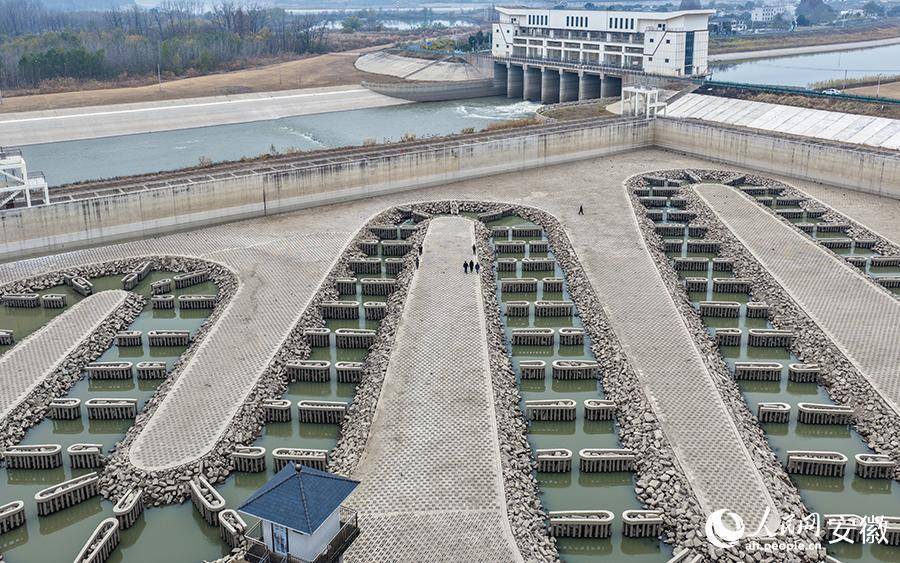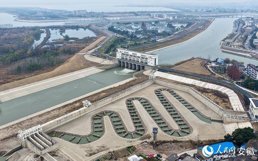枞阳引江枢纽位于铜陵市枞阳县与桐城市鲟鱼镇交界处,一侧连着长江,一侧连着菜子湖。过鱼设施位于原枞阳闸闸址、长江河道和长河河道交汇处,包括入湖鱼道、入江鱼道、补水连通渠及仿自然通道四个部分。鱼道设计蜿蜒曲折、宽窄各异,采用模拟原有自然环境状态的设计,最大限度减少水利工程对流域内鱼类洄游的影响,保护好流域生态。