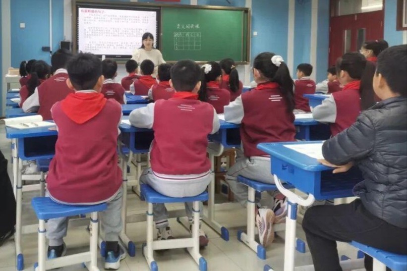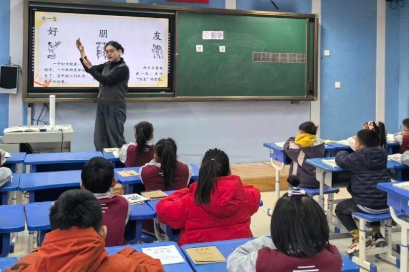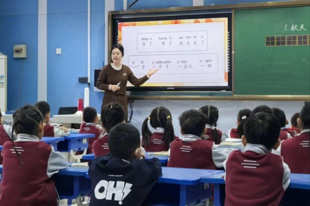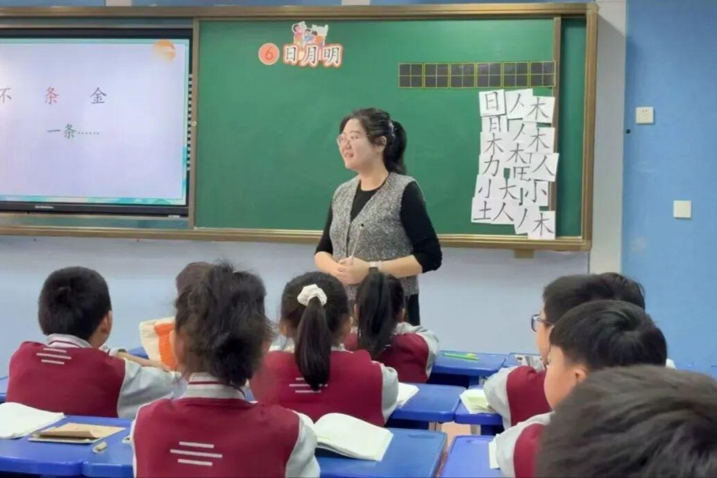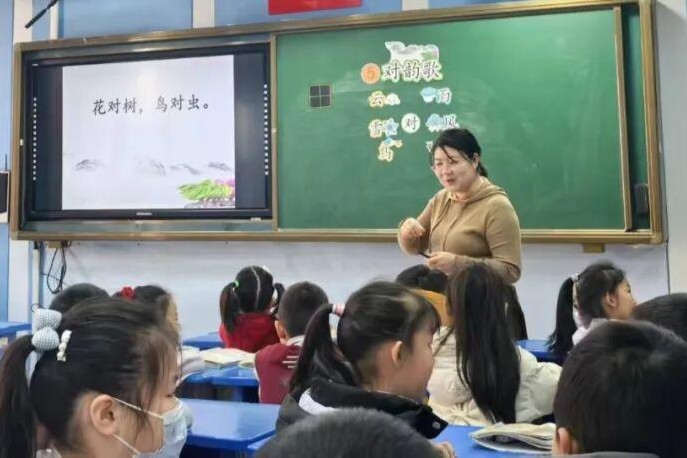 教师周妍妍执教的《对韵歌》以古人对对子的传统形式导入新课,通过范读、自读、分组读等多元形式引导学生感知文本韵律;随后结合对子内容与生活场景开展识字教学,同步设计背诵挑战、对对子互动及生字书写等环节,在欢声笑语中让传统蒙学知识扎根学生心间,兼顾了课堂的趣味性与实效性。